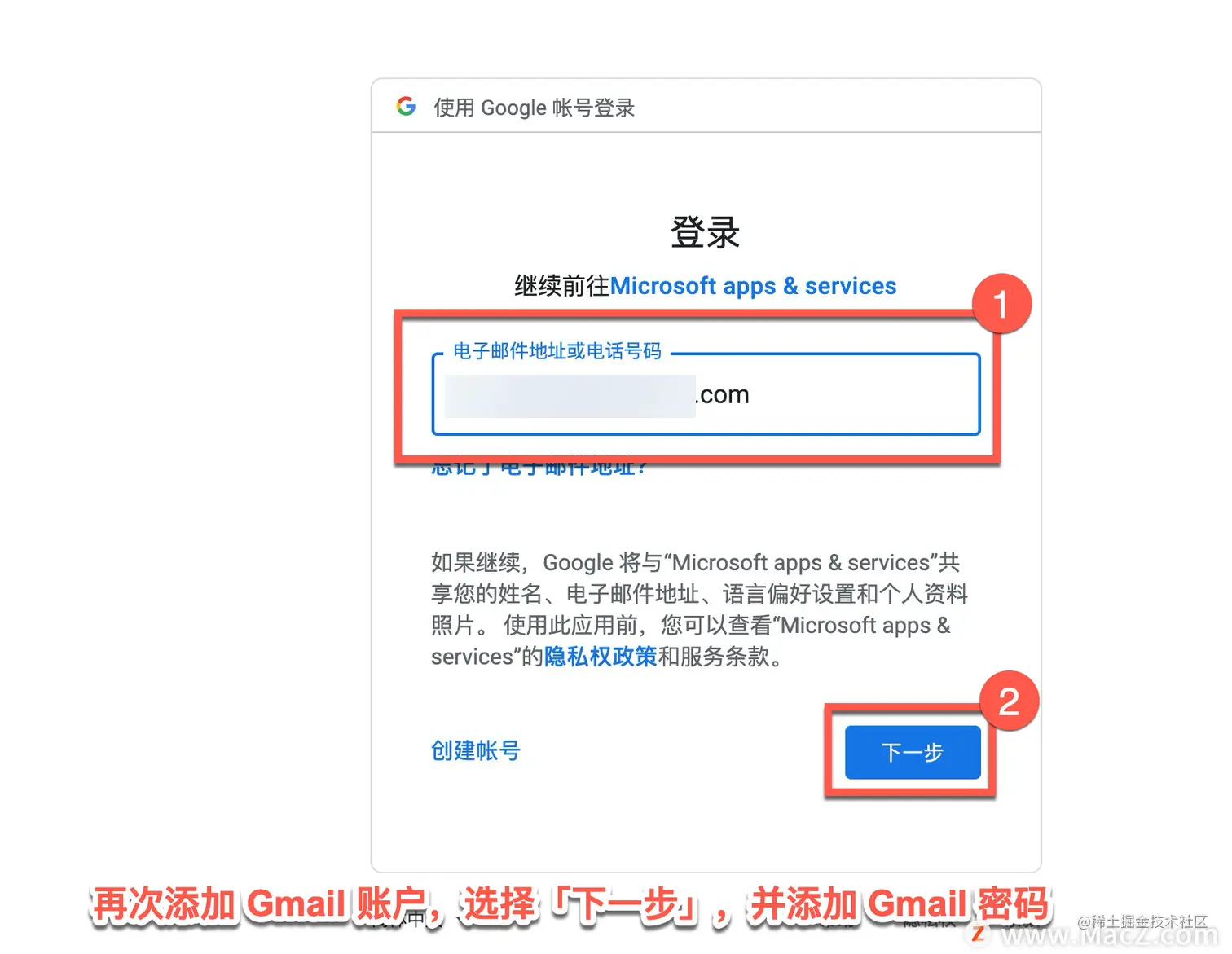 将会显示一个窗口,如果没有自动显示窗口,再次添加 GmAIl 账户,选择「下一步」,并添加 GmAIl 密码。
