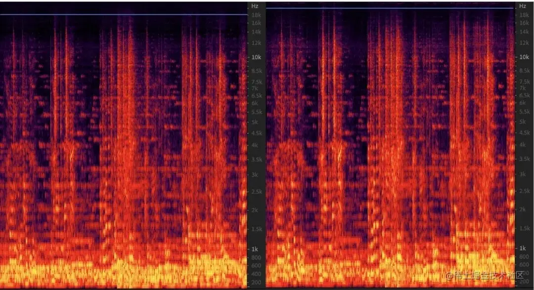 下面的这段来自《午夜怨曲》,从频率分布图可以看出,超分处理后,一方面,原始音频大于18kHz的高频信息得到了一定程度的拓展补全;另一方面,10kHz和18kHz之间的高频信息同样得到了增强。在听感上,处理后的声音更加清晰明亮。