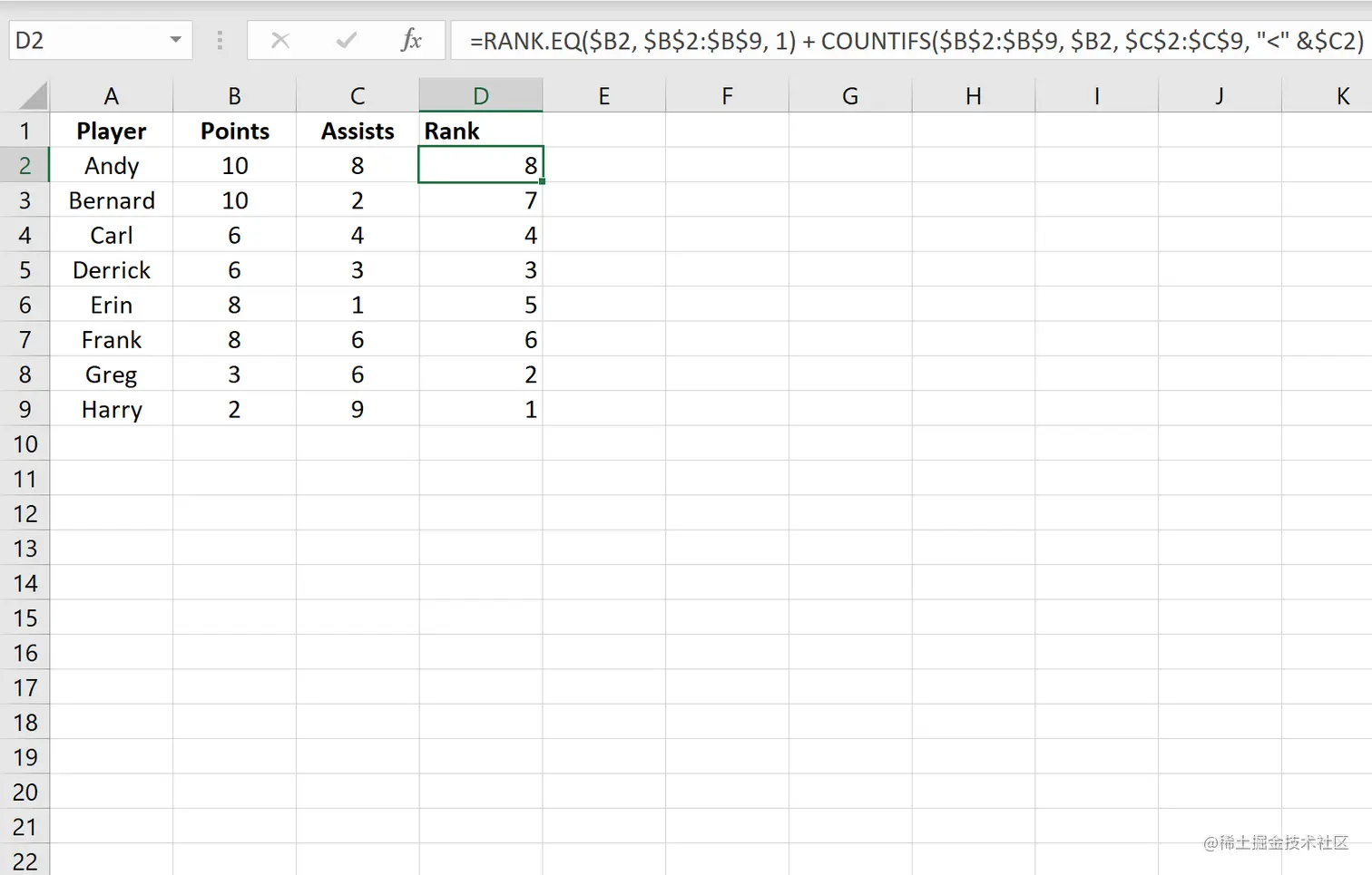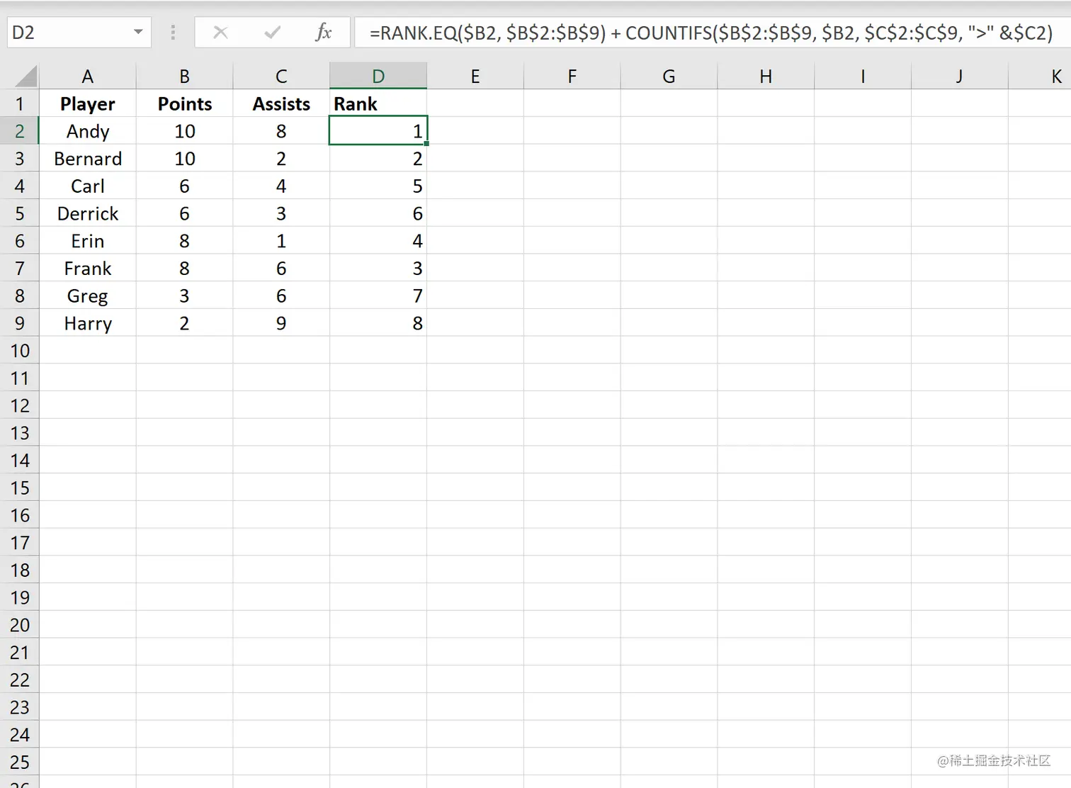 从输出结果中我们可以看到,安迪得到的排名是1,因为他与伯纳德并列得分最高。然而,安迪的助攻数比伯纳德多,所以他的排名是1,而伯纳德的排名是2。
