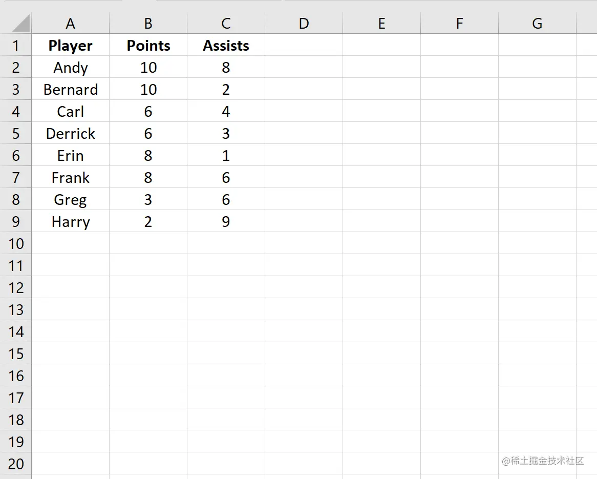 假设我们在Excel中有以下数据集,显示了8个不同的篮球运动员的总得分和助攻。