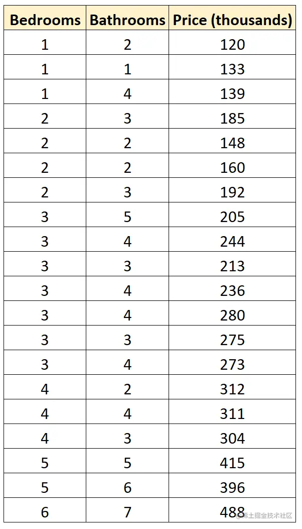假设我们有以下数据集,显示了某一社区20个不同房屋的卧室数、浴室数和销售价格。