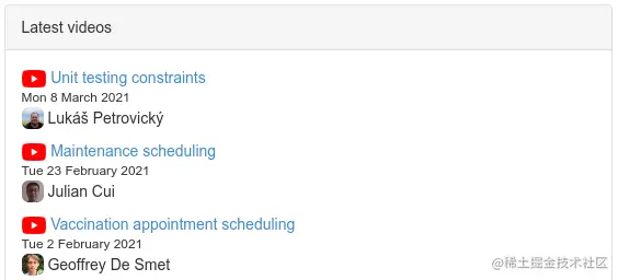 - youtubeId: blK7gxqu2B0title:"Unit testing constraints"...- youtubeId: gIaHtATz6n8title:"Maintenance scheduling"...- youtubeId: LTkoaBk-P6Utitle:"Vaccination appointment scheduling"... -