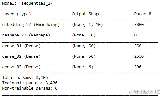 在嵌入 层中,参数input_dimensions指的是我们拥有的值的数量,output_dimensions指的是我们要减少的向量空间。总而言之,我们想用10个值来表示500个可能的状态,嵌入层正是用于此。在这一层之后,重塑 层为具有三个密集层的前馈神经网络准备 数据。