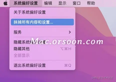 2、在左上角菜单中,选择“抹掉所有内容和设置”,如下图。如果没有这个选项,说明你的Mac不支持这个功能。