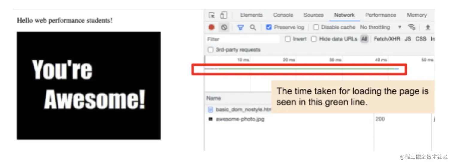 下面是一段HTML代码的演示结果,显示了一些文字和图片。正如你所看到的,整个页面的显示只花了大约40ms。即使有一张图片,页面显示的时间也更短。这是因为在进行第一次绘制时,图像没有被当作关键资源。
