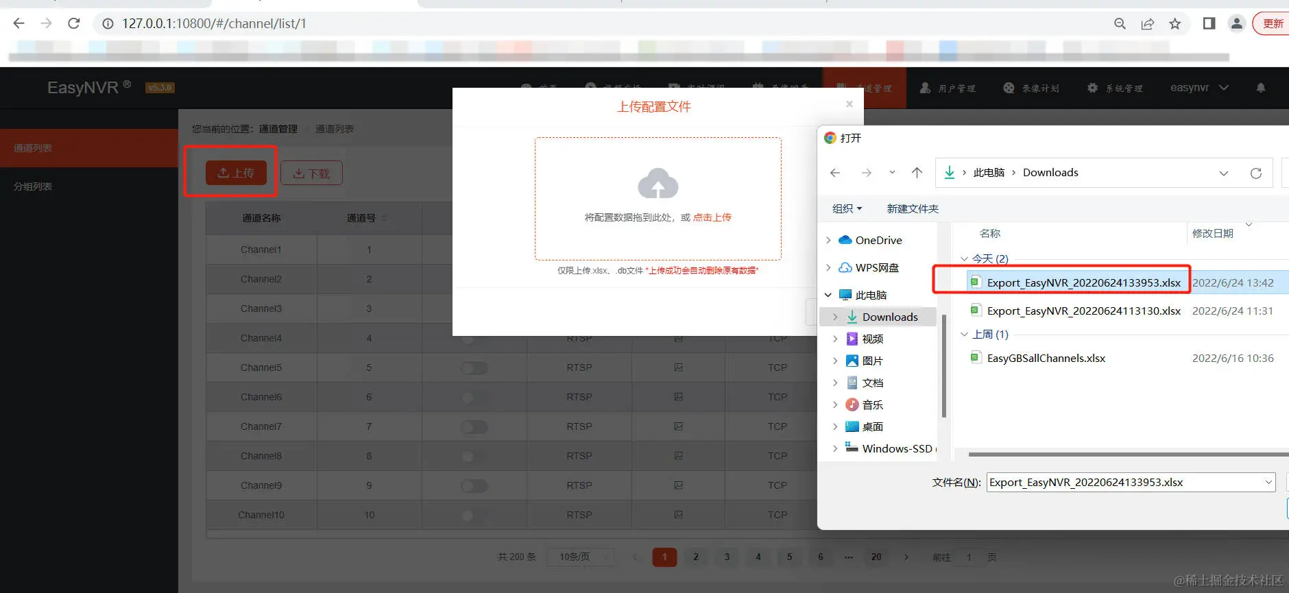 5)信息更换到EasyNVR的表格内后,保存退出,然后在EasyNVR【通道列表】页面进行上传,如图: