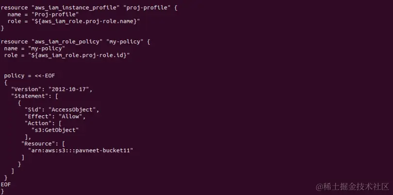 **第二步:**现在创建另一个名为bucket的目录,这是另一个模块。创建一个main.tf和output.tf文件。在main.tf中,我们正在创建一个S3 bucket和一个角色,并将其附加到实例配置文件中,因此它可以进一步被分配到EC2。