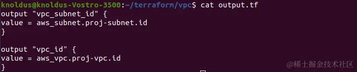 在同一目录下,vpc,创建另一个文件output.tf。在这个文件中,两个输出被声明,因为它们的值在实例模块中也需要。