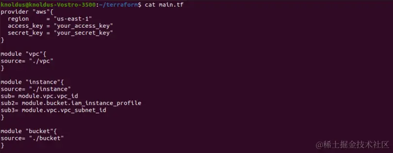 **第四步:**在terraform目录下,创建一个名为main.tf的文件。在这个文件中,提到了提供者的细节。我们创建的3个模块被调用。vpc和bucket模块的输出被声明为实例模块中的变量,以便它们可以在其中使用。