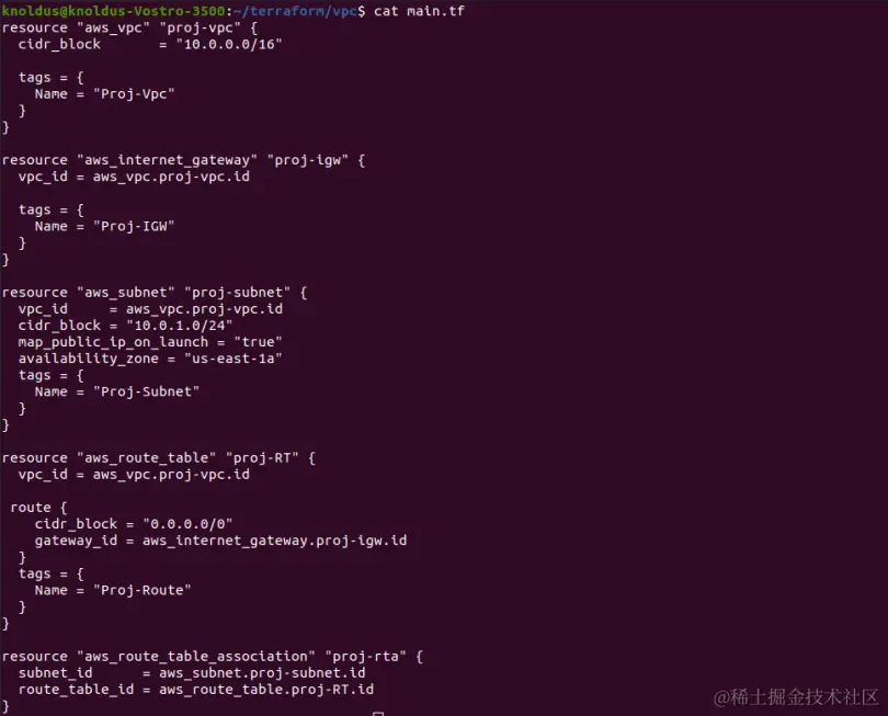 **第1步:**创建一个名为terraform的目录。现在在其中创建一个名为vpc的目录,这是我们的第一个模块。创建一个main.tf,它将有以下代码。在这段代码中,我们正在创建一个vpc,然后是一个子网。该子网通过附加一个互联网网关而成为公共网络。