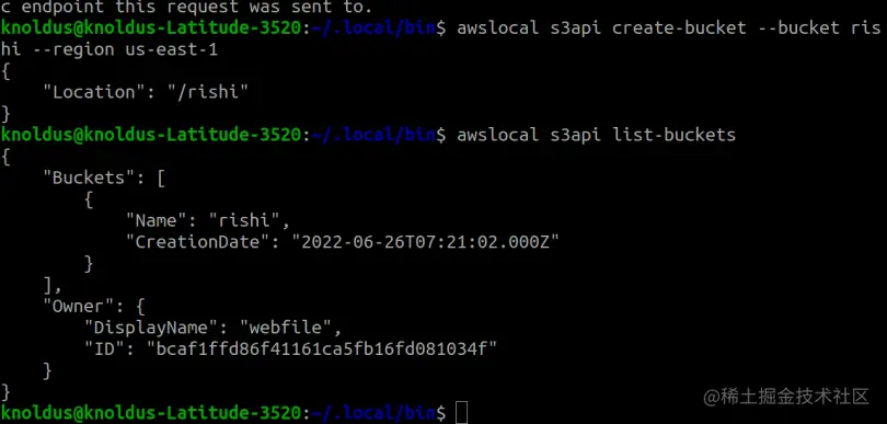 在上面的命令中使用了awslocal cli.名为rishi的桶被创建在us-east-1区域。