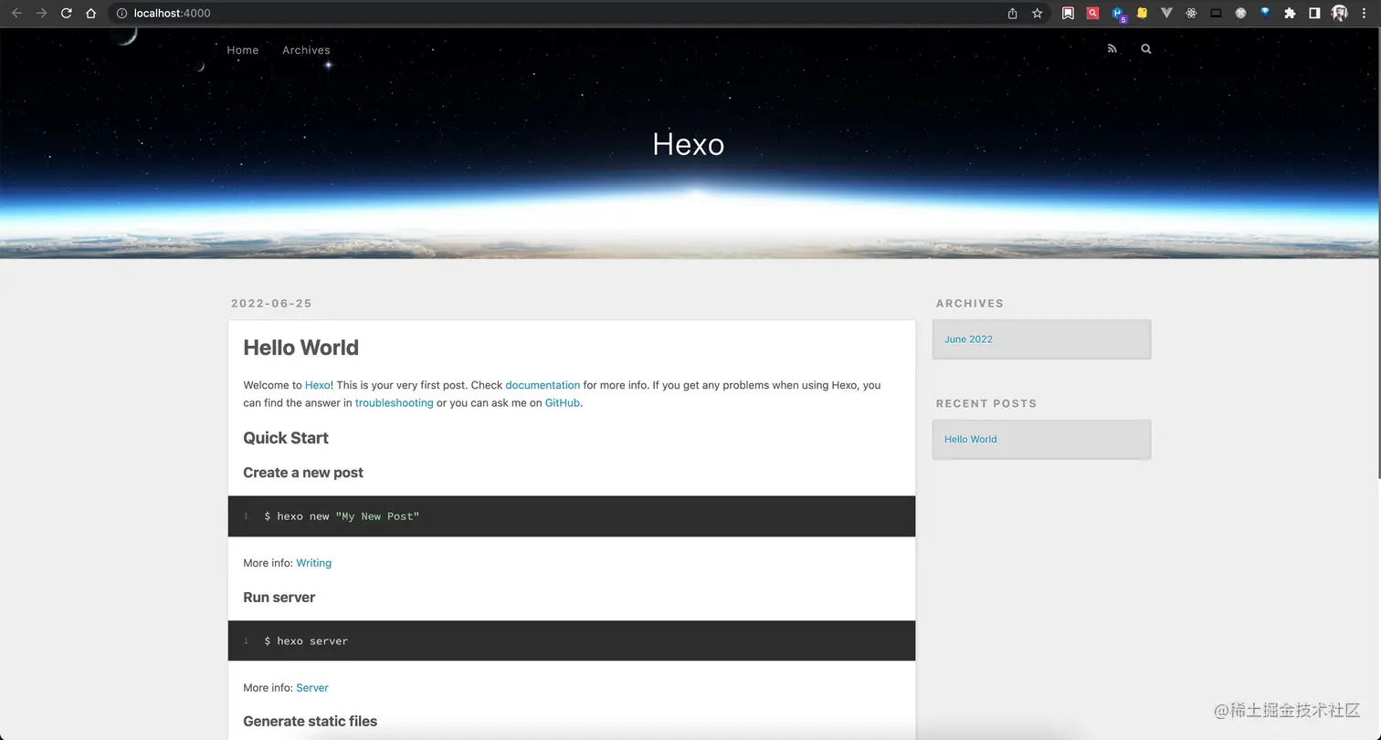 然后我们访问http://localhost:4000/,便可以看到hexo生成的站点