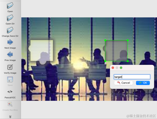 点击 Open Dir 打开 data/captcha/images/ 目录,然后点击左下角的 Create RectBox 创建一个标注框,我们可以将缺口所在的矩形框框选出来,框选完毕之后 labelImg 就会提示保存一个名称,我们将其命名为 target,然后点击 OK,如图所示: