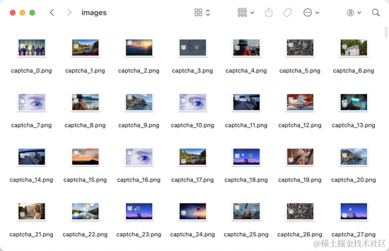 在这里我们先定义了一个循环,循环次数为 COUNT 次,每次循环都使用 Selenium 启动一个浏览器,然后打开目标网站,模拟点击登录按钮触发验证码弹出,然后截取验证码对应的节点,再用 screenshot 方法将其保存下来。