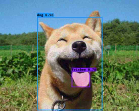 可以看到这只狗和它的舌头就被框选出来了,这就完成了一个不错的目标检测。
