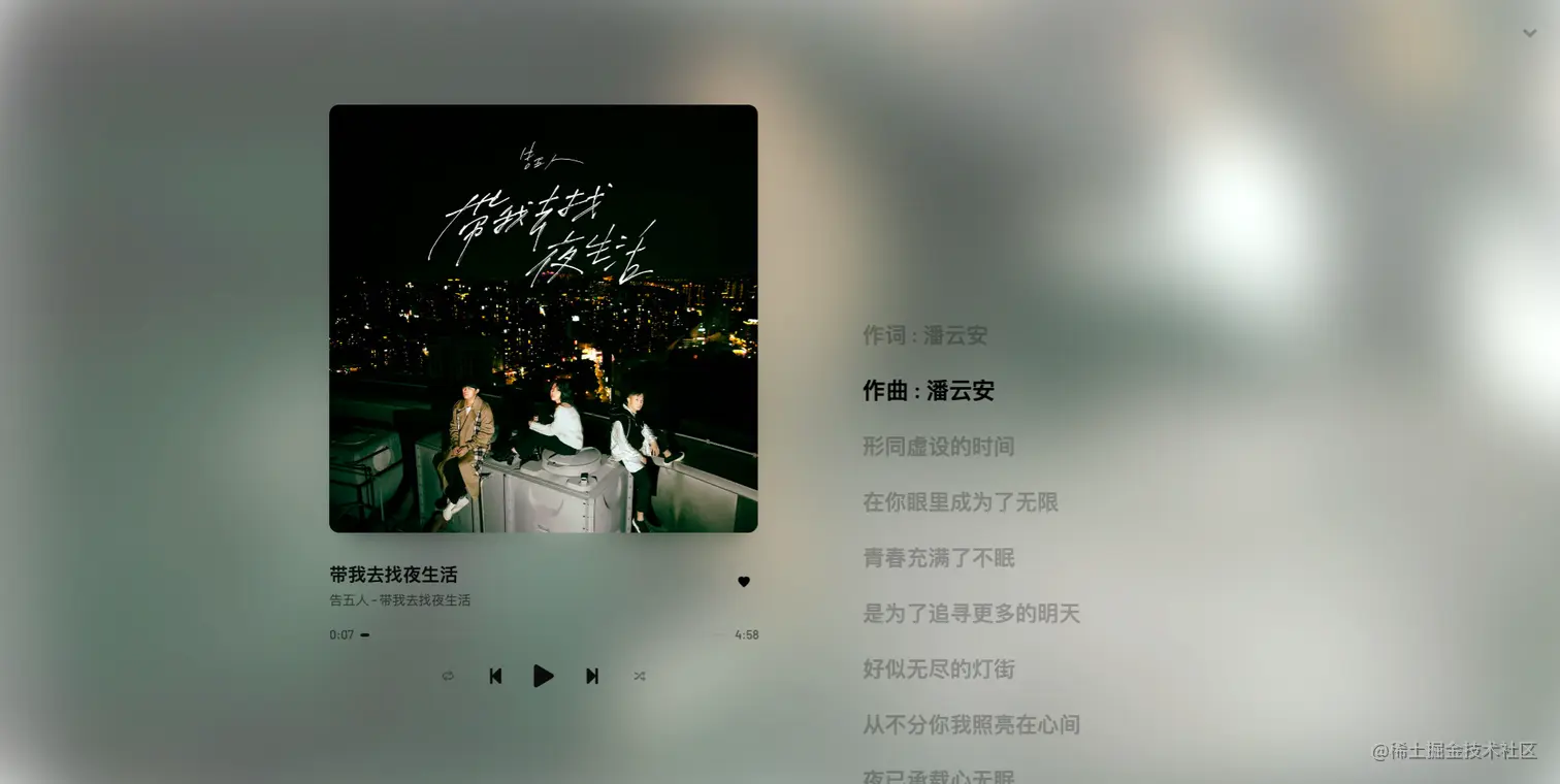 点击底部栏会上划打开一个全屏的播放界面,可以看到歌词:
