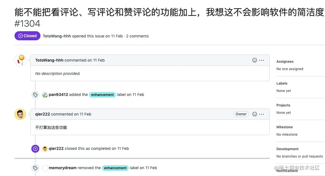 听歌看评论已经成为一种习惯了,评论最初也是网易云音乐的特色,但是很可惜这个项目并不支持查看评论功能,作者也明确表示不会支持: