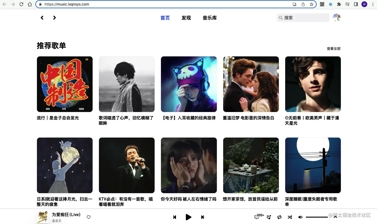 当然这个项目的基础是另一个开源项目:github.com/Binaryify/N…,顾名思义,就是网易云音乐的api,这也是一个第三方项目,支持官方的所有接口,使用nodejs开发,基于express框架,请求库使用的是axios,原理是跨站请求伪造 (CSRF),通过伪造请求头,调用官方API,简单来说,就是因为我们的网站域名和网易云音乐的域名不一样,如果直接请求网易云音乐官方的接口,网易云音乐服务器和浏览器为了安全都不允许我们这么干,所以我们需要一个不会被限制的中间商,也就是后端服务,然后我们的网站请求这个服务的接口,带上认证的cookie,这个服务使用cookie,并且另外再伪造一些请求头,目的是让网易云音乐官方服务器认为它是个浏览器,这样它就可以帮我们调网易云音乐官方的接口,然后这个服务再设置为允许跨域请求,那么我们的网站就可以通过请求这个中间商而获取网易云音乐官方的数据。