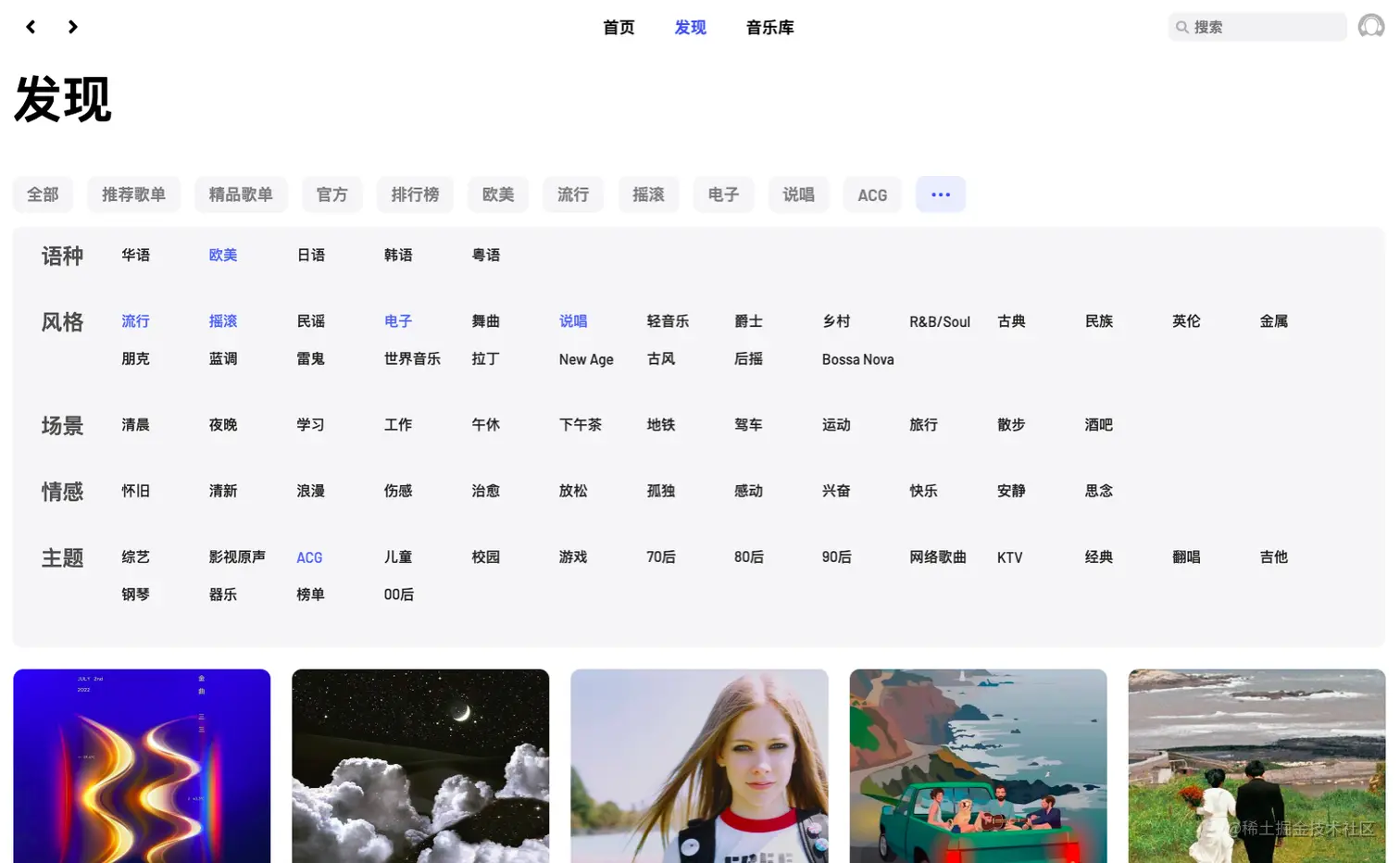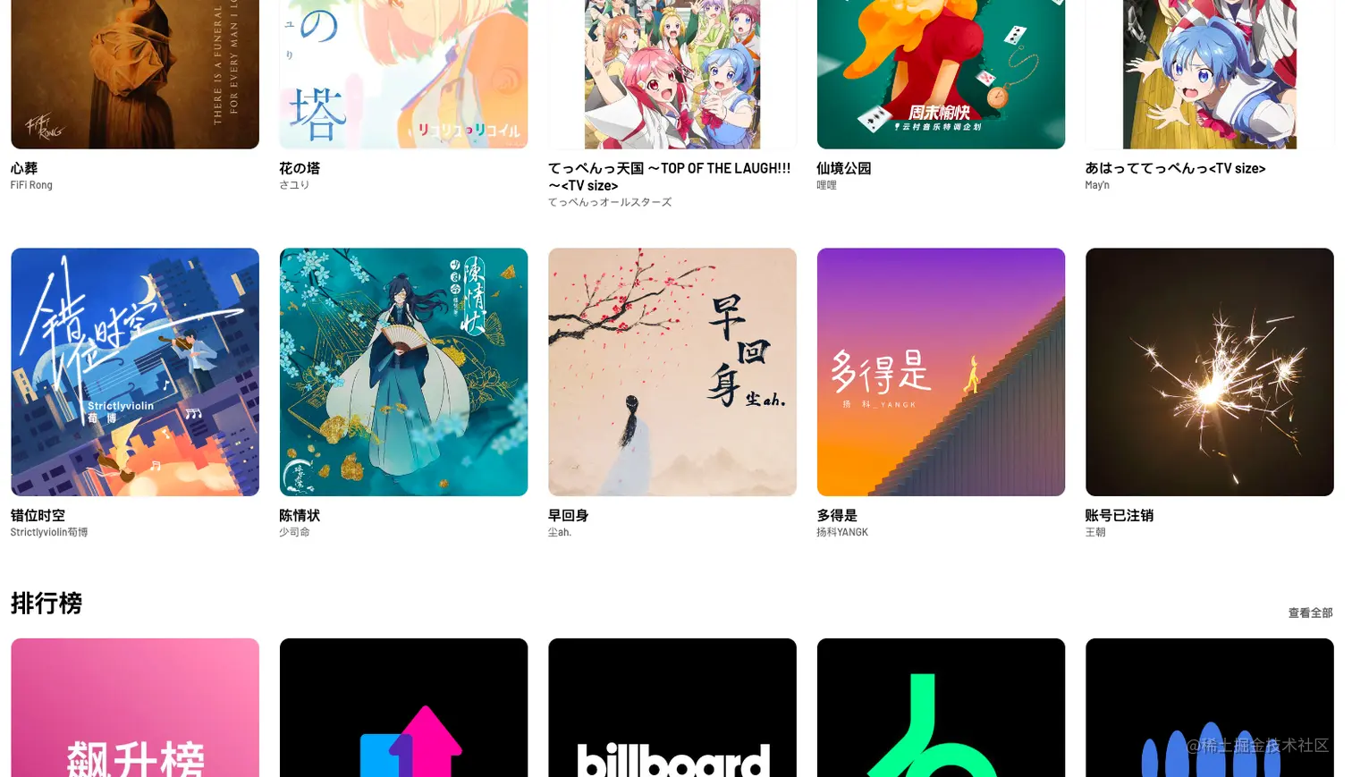 首页部分栏目可以点击查看全部跳转到发现页,当然也可以直接点击顶部的tab切换到发现页,发现页主要是查看推荐歌单、排行榜、按分类搜索歌单: