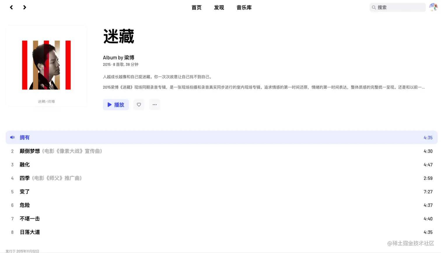 点击某个歌单或专辑可以跳转到歌单详情页面,详情页面可以查看简介、歌单所有歌曲,当然也可以进行播放: