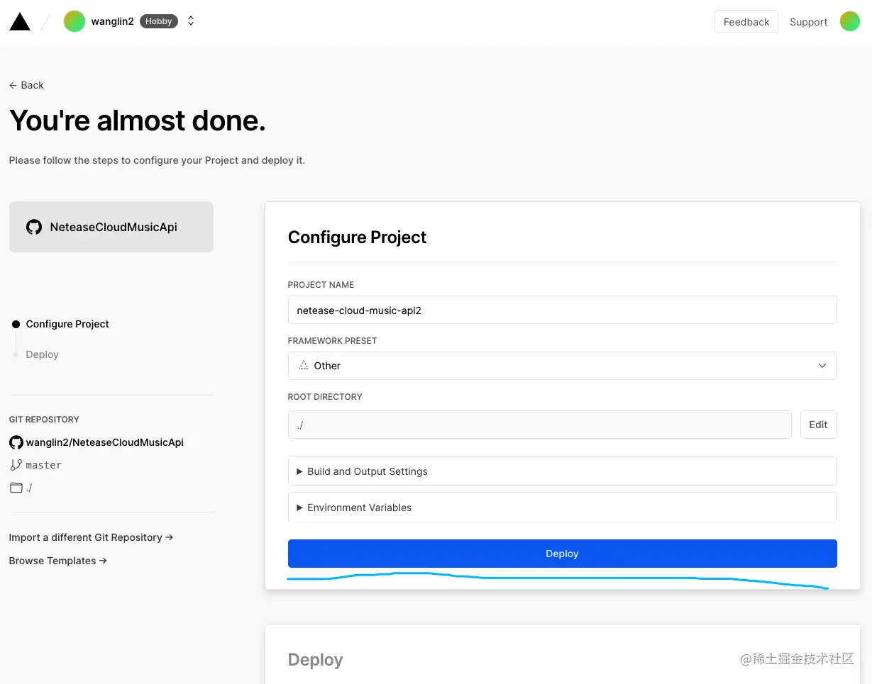 点击 【Environment Variables】,填写 Name 为 VUE_APP_NETEASE_API_URL,Value 为 /api,点击 【Add】。最后点击【Deploy】就可以部署到Vercel了。