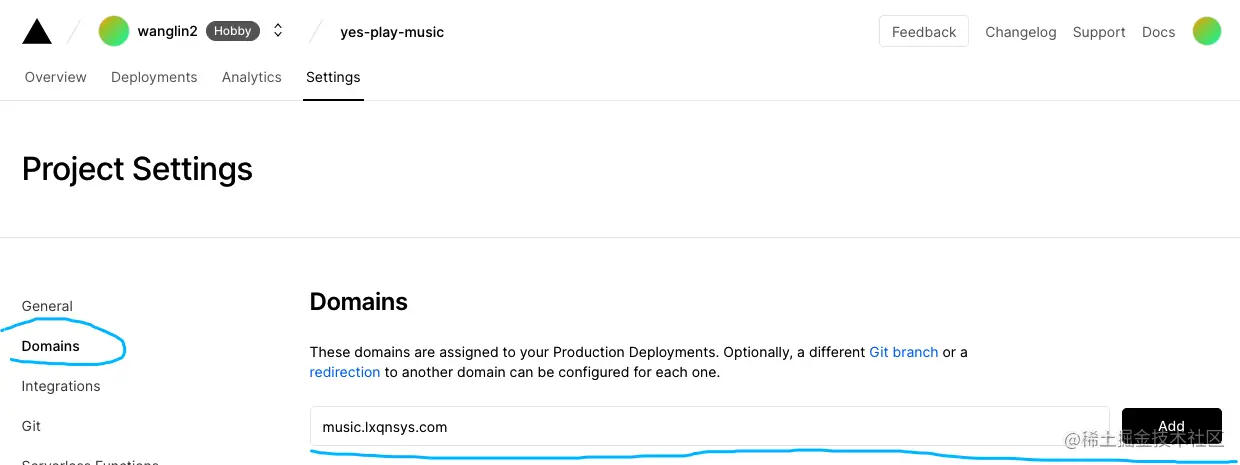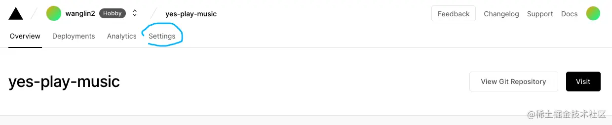默认生成的域名是Vercel的子域名https://xxx.vercel.app,如果你自己有域名,那么也可以绑定成你自己的,在项目详情页面点击【Setting】按钮: