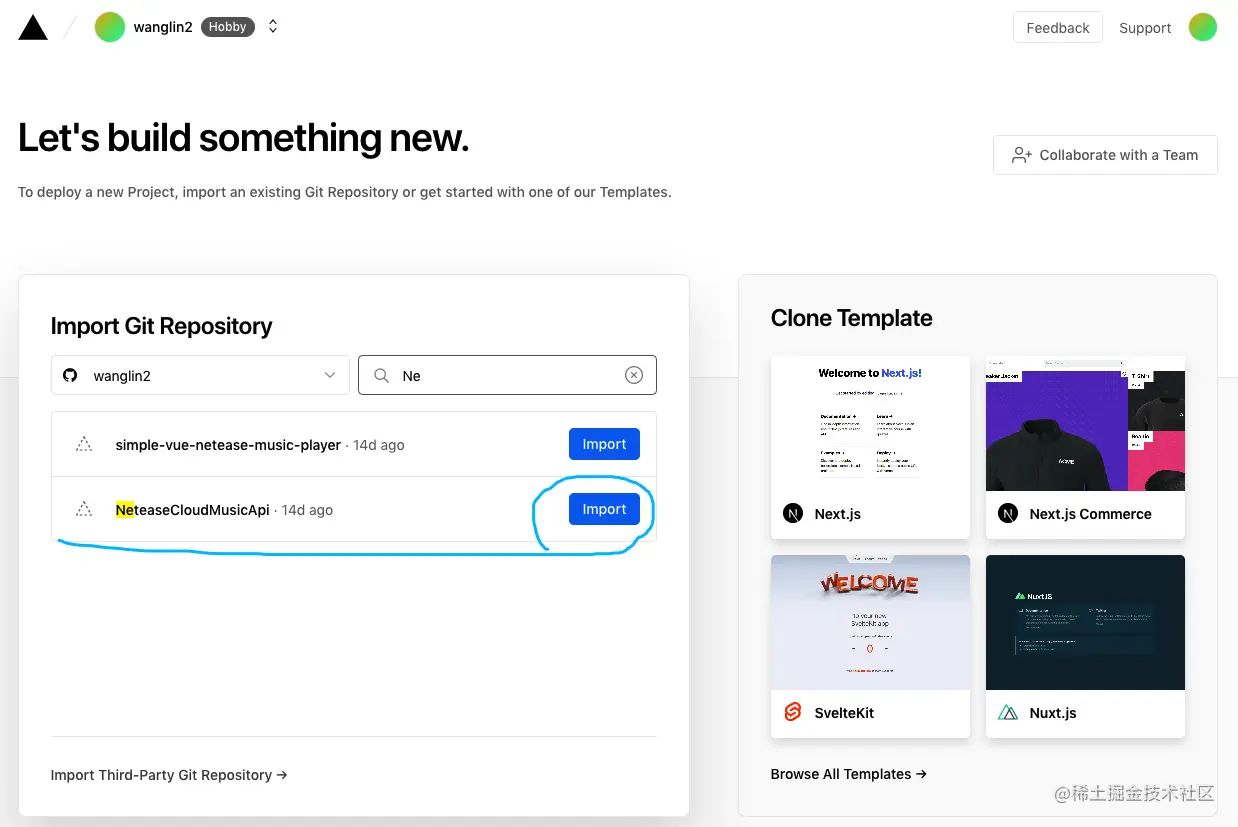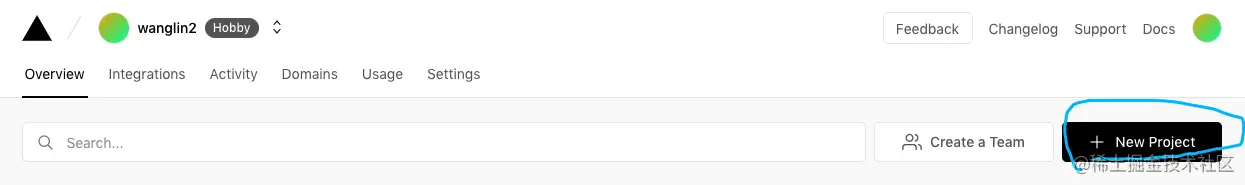 然后打开Vercel网站,点击右上角的【New Project】按钮创建新项目: