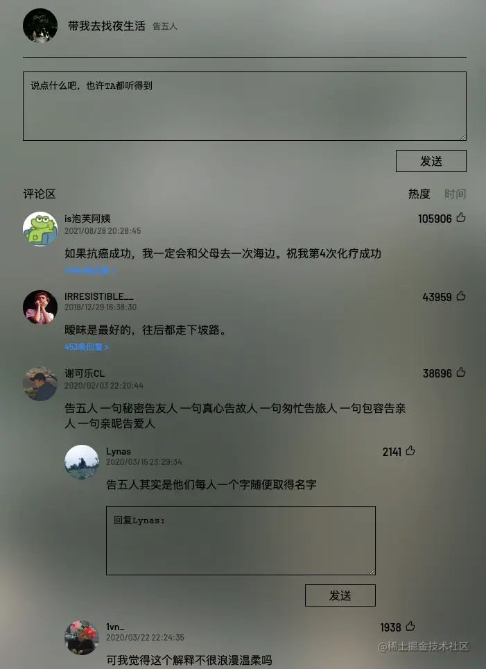 支持热度和时间两个维度排序,也支持查看楼层回复,可以对歌曲发表评论,也可以点击某个楼层进行回复,不过目前有一个小问题,发表的评论或点赞数据不会立刻出现,需要等待一会(两分钟)刷新列表才会显示,原因是因为api服务增加了缓存处理: