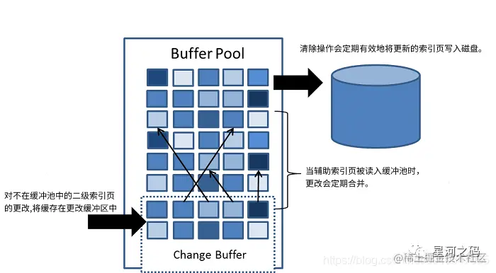 Change Buffer是在【非唯一普通索引页】不在buffer pool中时,当对页进行了写操作时,在不影响数据一致性的前提下。InnoDB会将数据先写入Change Buffer中,等未来数据被读取时,再将 change buffer 中的操作merge到原数据页中。