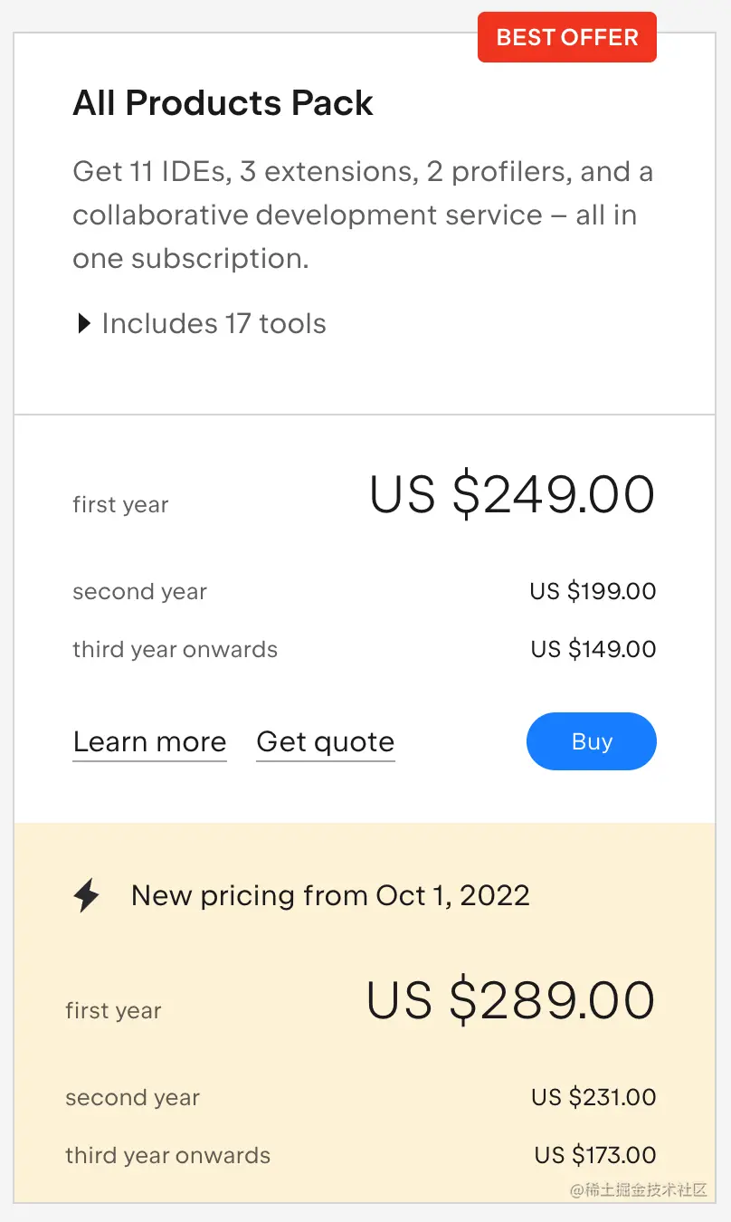 公告称,此次价格调整涉及到其IDE、.NET 工具、dotUltimate 和 All Products Pack,并将于 2022 年 10 月 1 日生效,并且在新价格生效前按当前价格预付订阅。