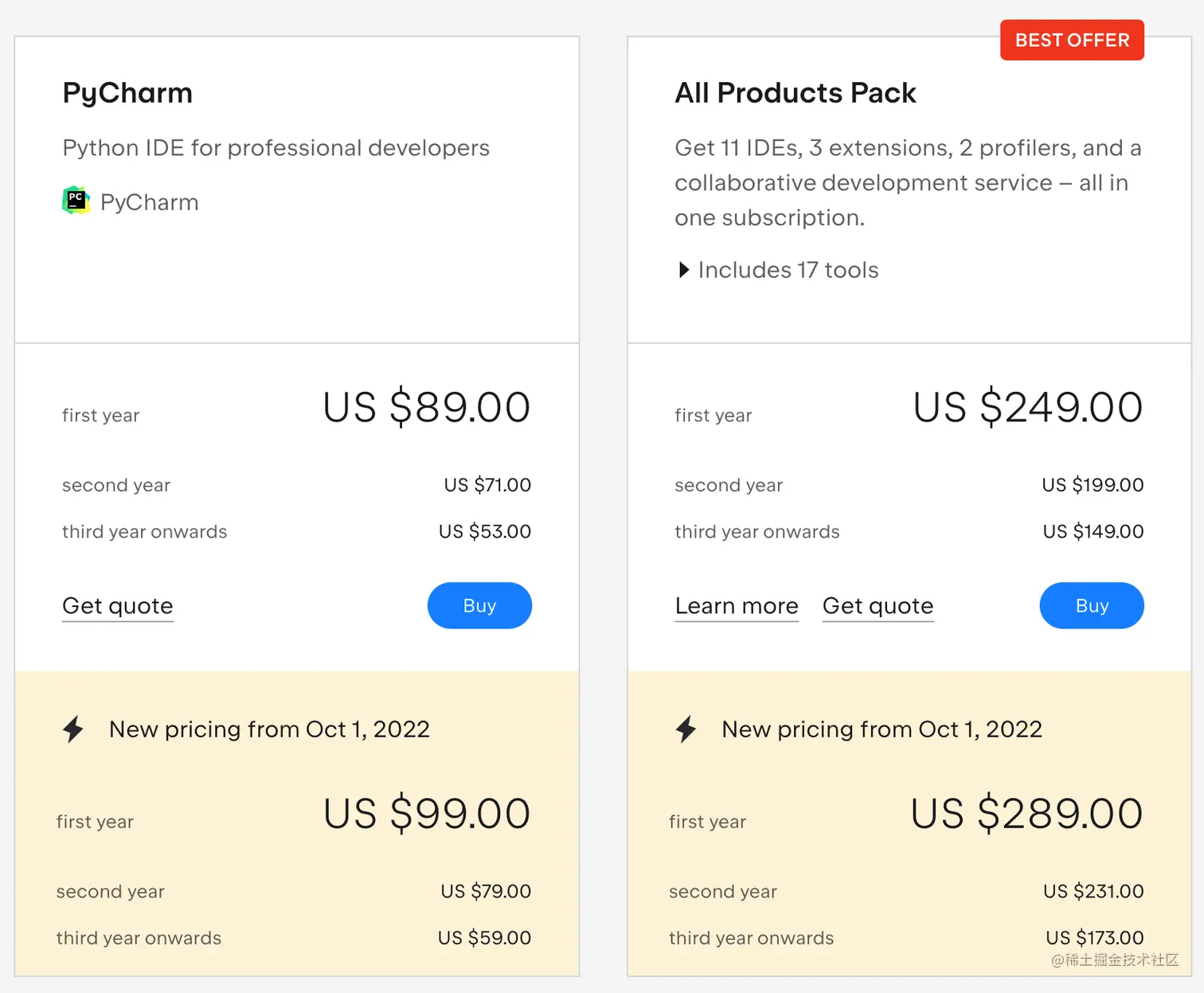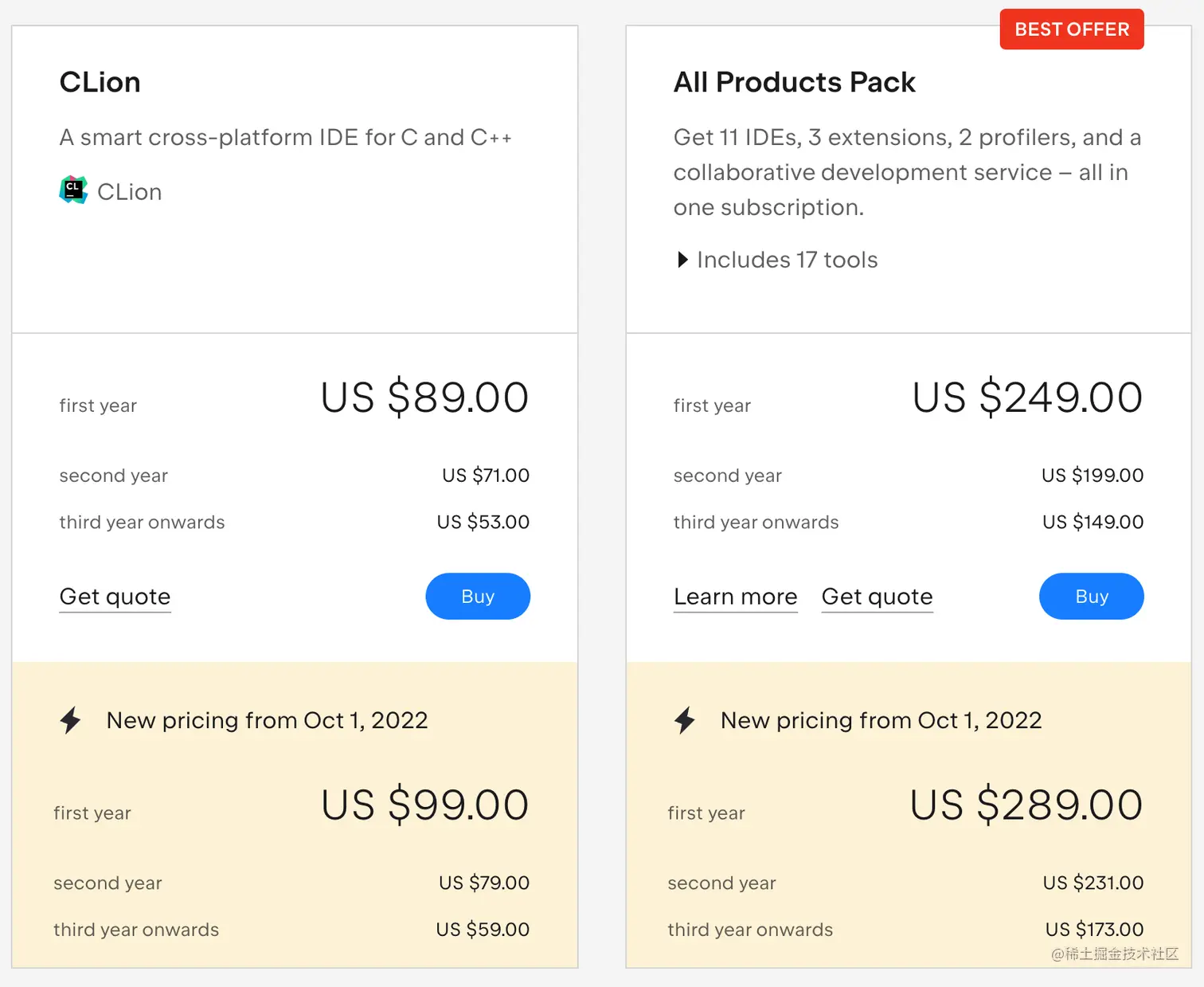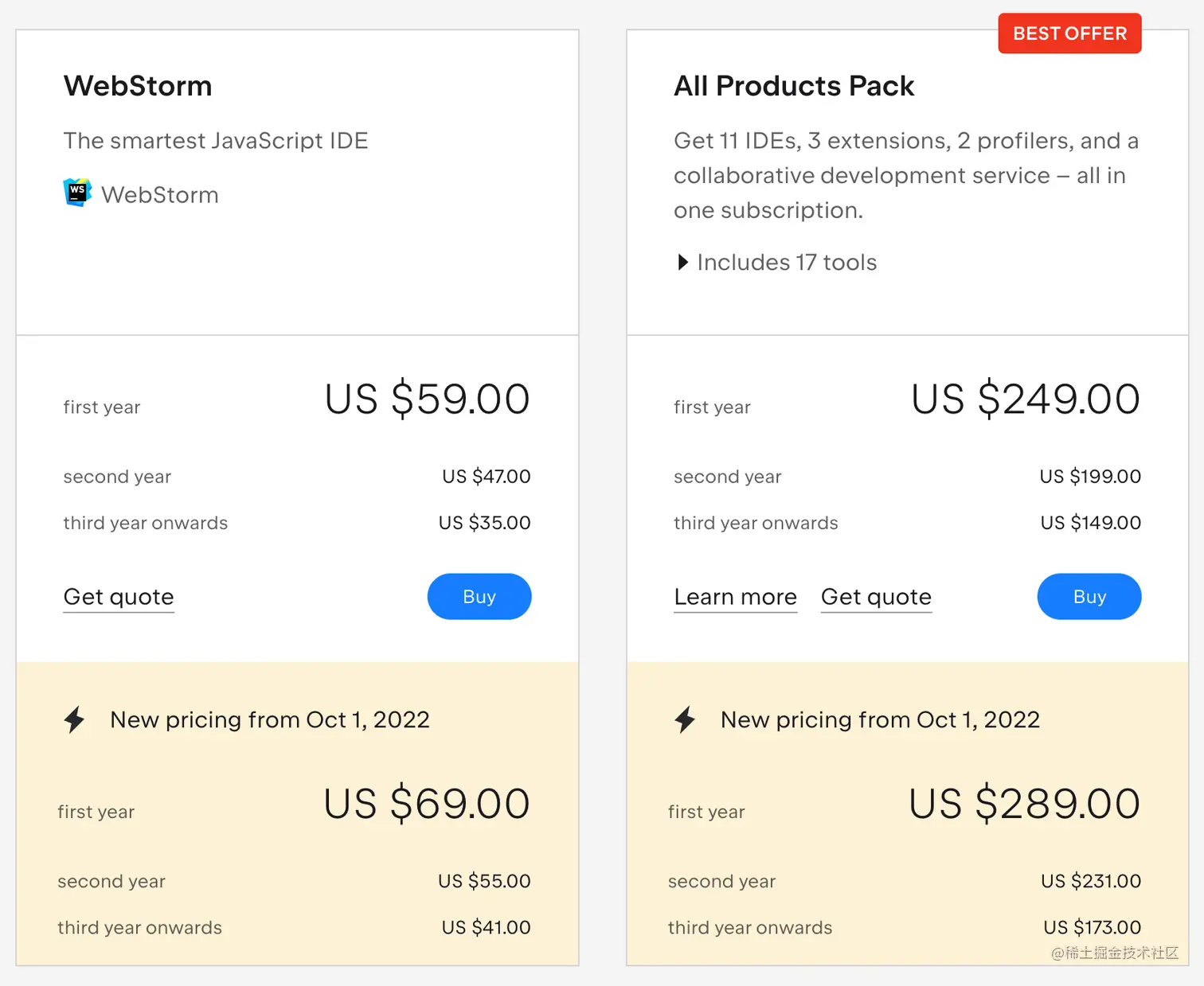 除此之外,其他几个比较火的IDE,像CLion、WebStorm、PyCharm等也都有一定幅度的价格上调。