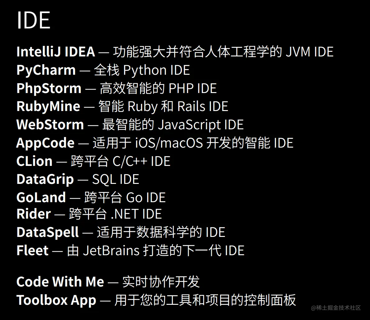 说回到JetBrains这个公司,想必大家也都了解一些,毕竟像IntelliJ IDEA、CLion、PyCharm、WebStorm、DataGrip等编程IDE和开发工具都是出自该公司之手。