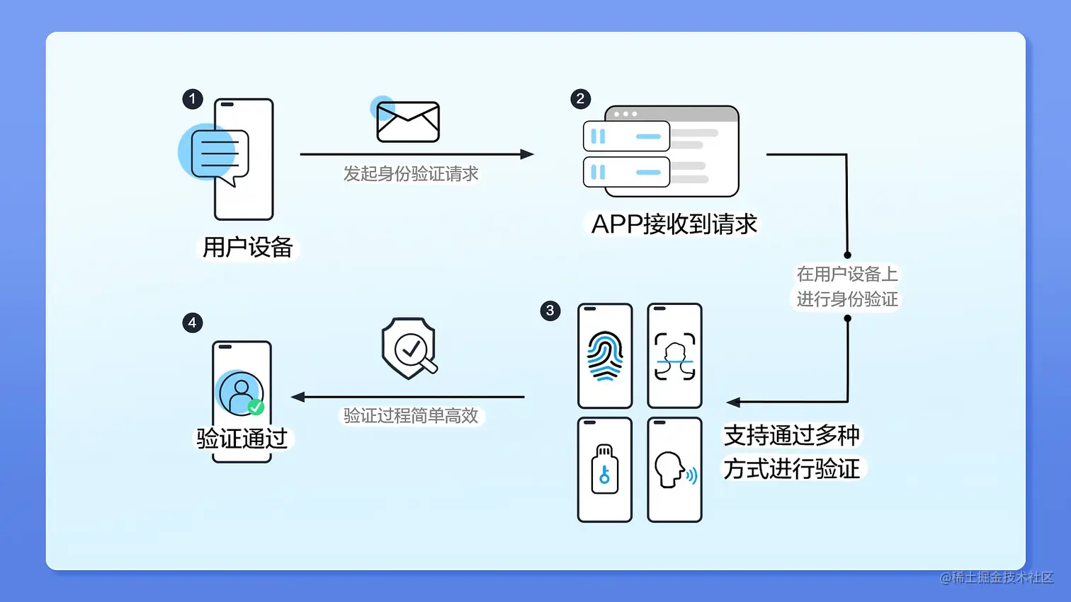 其实,在很早之前,就有人开始设想“无密码登录”。当然,“无密码登录”并不等于没有密码,而是用新的身份验证方式,来取代现有密码验证体系。HMS Core 线上快速身份验证服务(HMS Core FIDO)基于这个出发点,为开发者提供了一种更具优势的解决方案:无密码的用户身份验证,提供本地生物特征认证和线上快速身份验证能力,可用于用户登录、购买支付等场景,同时,通过系统完整性检测和密钥校验机制,来保证验证结果安全可信。实现流程如下。