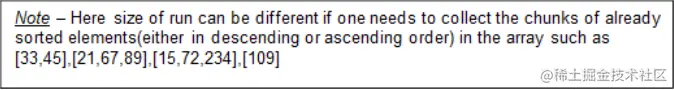 Tim Sort的工作原理是:对小的排序块进行合并排序,使其性能快速。因此,在这里,我们的工作是将数组分割成相同大小的不同运行,并使用插入排序对其进行排序。