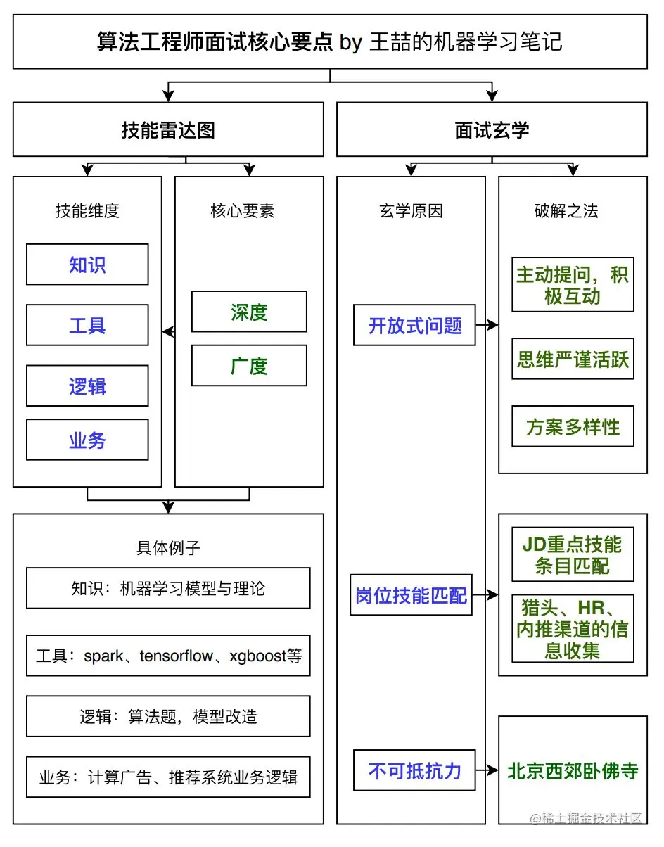 以上的内容总结了所有机器学习岗面试的目的、方法,以及影响最终offer的一些要素。我们这里用一个框图来总结一下这些内容: