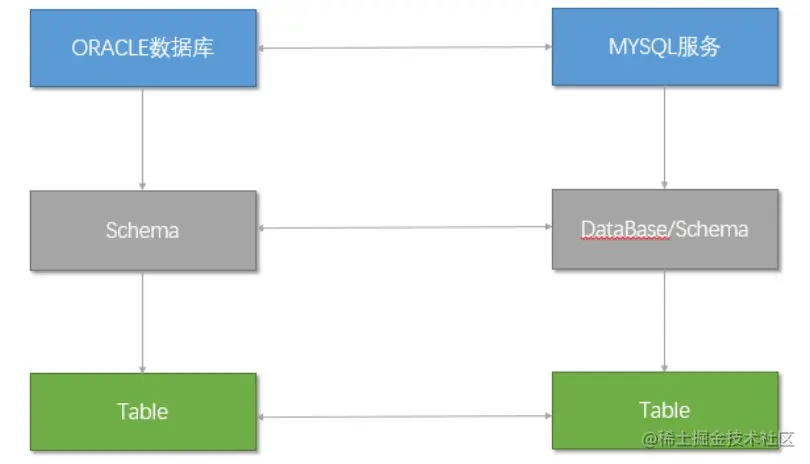 - 在MySQL中的Schema比较特殊,他对应的是MySQL实例下不同的数据库 database。