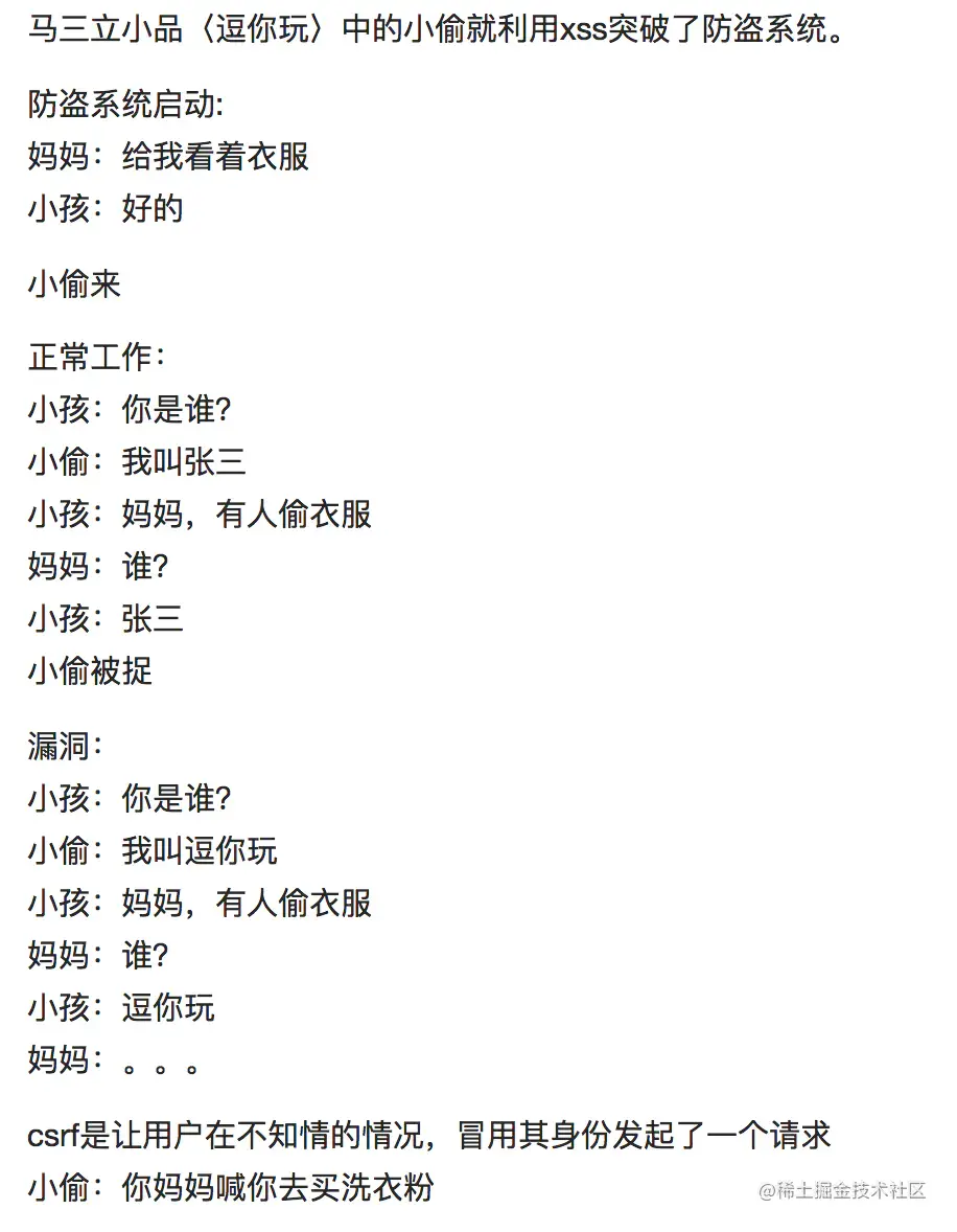 本质上讲,XSS 是代码注入问题,CSRF 是 HTTP 问题。XSS 是内容没有过滤导致浏览器将攻击者的输入当代码执行。CSRF 则是因为浏览器在发送 HTTP 请求时候自动带上 cookie,而一般网站的 session 都存在 cookie里面。