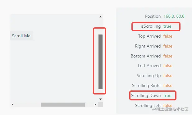 如上图所示,当向下滑动或者拖拽竖直方向的滚动条时则isScrolling为true表示正在向下滚动,同时useScroll能够识别出滚动方向为向下。
