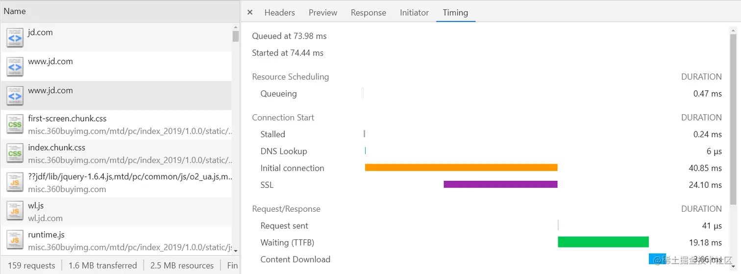 Queuing: 请求发送前会根据优先级进行排队,同时每个域名最多处理6个TCP链接,超过的也会进行排队,并且分配磁盘空间时也会消耗一定时间。Stalled:请求发出前的等待时间(处理代理,链接复用)DNS lookup:查找DNS的时间initial Connection:建立TCP链接时间SSL:SSL握手时间(SSL协商)Request Sent:请求发送时间(可忽略)Waiting(TTFB) :等待响应的时间,等待返回首个字符的时间Content Dowloaded:用于下载响应的时间
