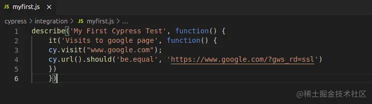 | describe('My First Cypress Test', function() { it('Visits to google page', function() { cy.visit("www.google.com"); }) }) |