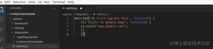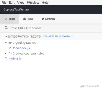 为了运行Cypress,我们需要打开Cypress测试运行器,然后从那里我们可以选择任何我们的.js文件并运行。js文件中已经有了测试案例。