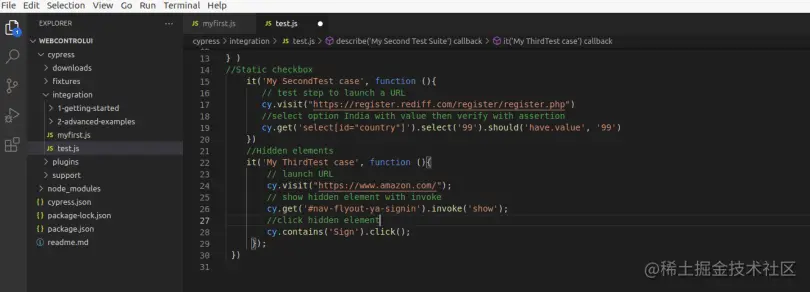 Cypress可以处理不可见元素。对于处理隐藏的元素,Cypress采取了jQuery方法show的帮助。它使用命令**(invoke['show'])。**