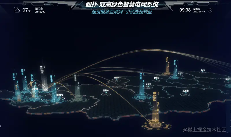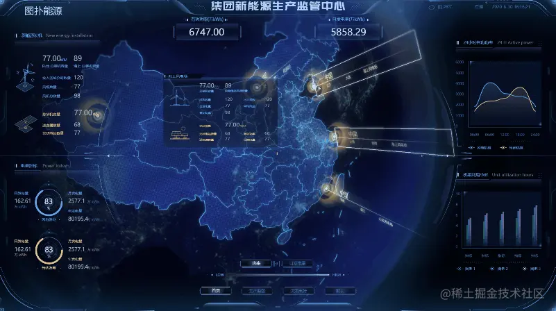 可再生能源装机量的迅速提升也为电力系统的稳定运行带来巨大压力。由于风电、光伏的输出功率受气象情况和运行环境影响较大,致使电站输出功率难以预测,亟需智慧电力一体化管控平台进行监管,以保障电网的平稳运行。运用图扑软件自主研发引擎 HT for Web,构建可交互式的 Web 三维电力场景,实现全国新能源设施的有效管控,保障电力系统的运行通畅。
