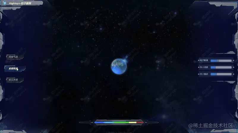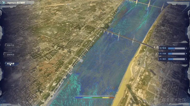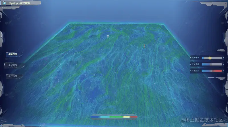 对于需要在一个面上展示的流体场,比如风场,水流场,压力场等,需要以动态的方式呈现,可以使用图扑粒子插件实现。在图扑软件可视化系统的主场景内可查看风电气流、全球风场、长江水场的粒子流动情况,右侧按钮可自由调节粒子数量、粒子速度、粒子痕迹,自定义粒子的行为。