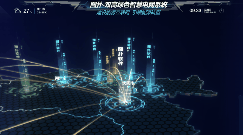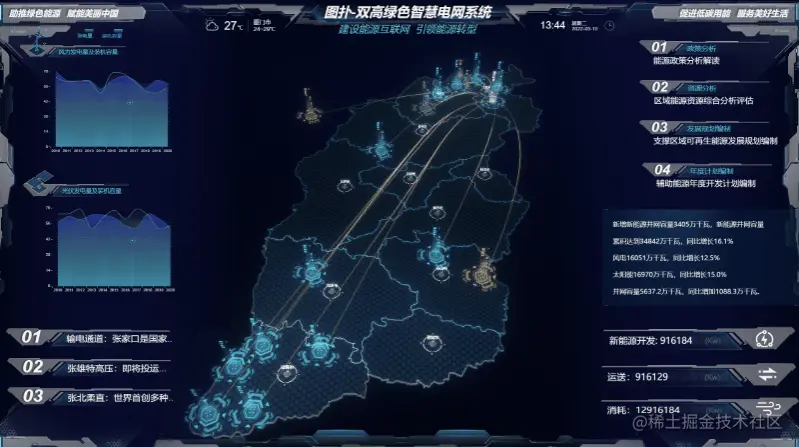 将电网数据的中控平台接入可视化系统,实现新能源开发、运送、消耗数据的实时驱动,便于运维掌握一手资料。将能源政策分析解读、区域能源资源综合分析评估、发展规划编制、年度计划编制在 Hightopo 可视化系统中展示,以规划后续新能源电力设施的建设。