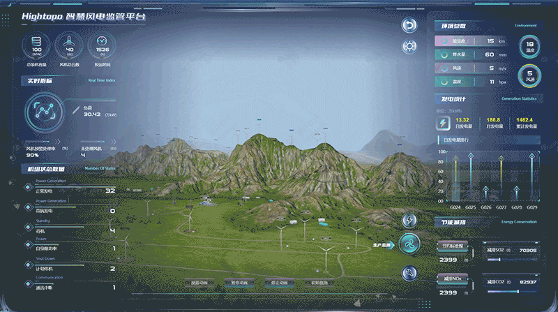利用自主研发引擎 HT for Web 将 2D 和 3D 无缝融合,在 2D 面板查看新能源陆地总装机容量、海上总装机容量;接入区域公司数量、风场数量、风机总数量、总装机容量、逆变器数量、光伏电站数量实现有效管控。