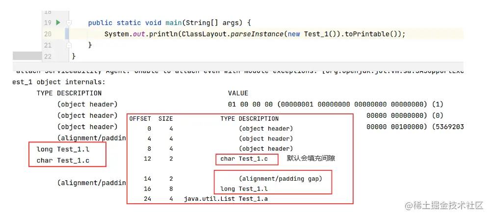 不管是否开启指针压缩,这块区域都要吃掉8B内存。那在关闭指针压缩的情况下,这块区域就浪费掉了4B内存。能忍?可忍可不忍。hotspot给了你选择权。通过修改-XX:+/-CompactFields的值,可以选择让hotspot是否往这块间隙中织入属性。默认是开启的。可以通过如下代码测试