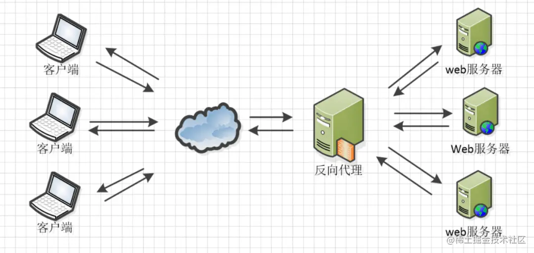 反向代理服务器位于用户与目标服务器之间,但是对于用户而言,反向代理服务器就相当于目标服务器,即用户直接访问反向代理服务器就可以获得目标服务器的资源。同时,用户不需要知道目标服务器的地址,也无须在用户端作任何设定。