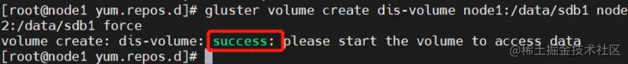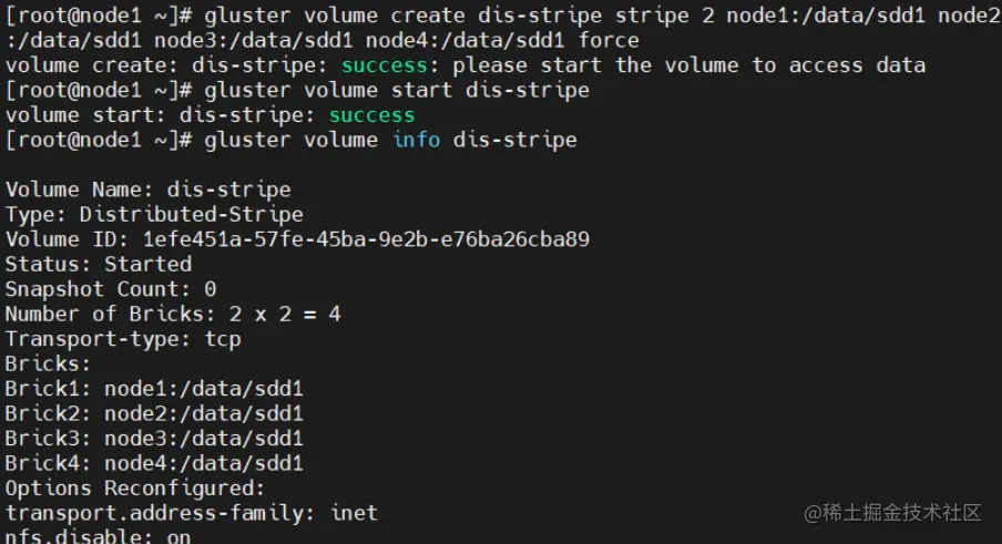 创建一个名为dis-volume的分布式卷,文件将根据HASH分布在server1:/dir1、server2:/dir2和server3:/dir3中