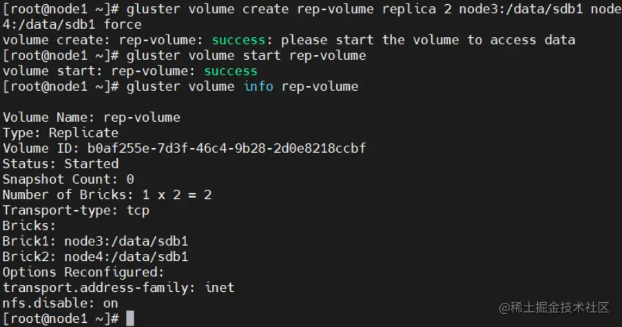 创建名为rep-volume的复制卷,文件将同时存储两个副本,分别在server1:/dirl和Server2:/dir2两个Brick中